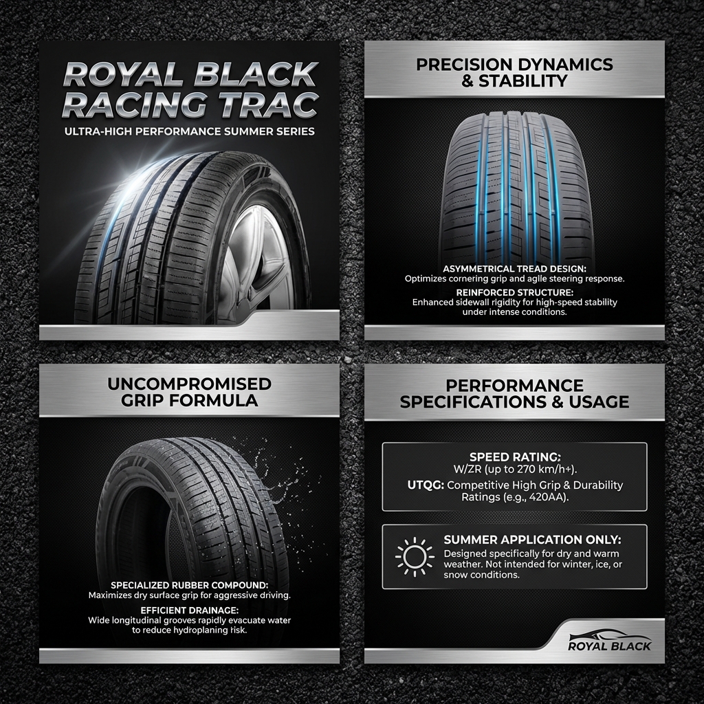 The Royal Black Racing Trac is a tire designed for high-performance/sporty driving on roads. It has been optimized for grip, drainage, and high-speed stability, ensuring your vehicle performs well both during daily commutes and intense driving.