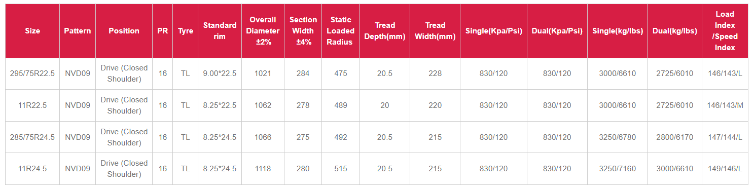 The NVD09 295/ is a typical medium to long-haul drive wheel tire for commercial trucks. Its design and tread pattern prioritize durability and stability, making it suitable for high-speed and main route transportation scenarios.