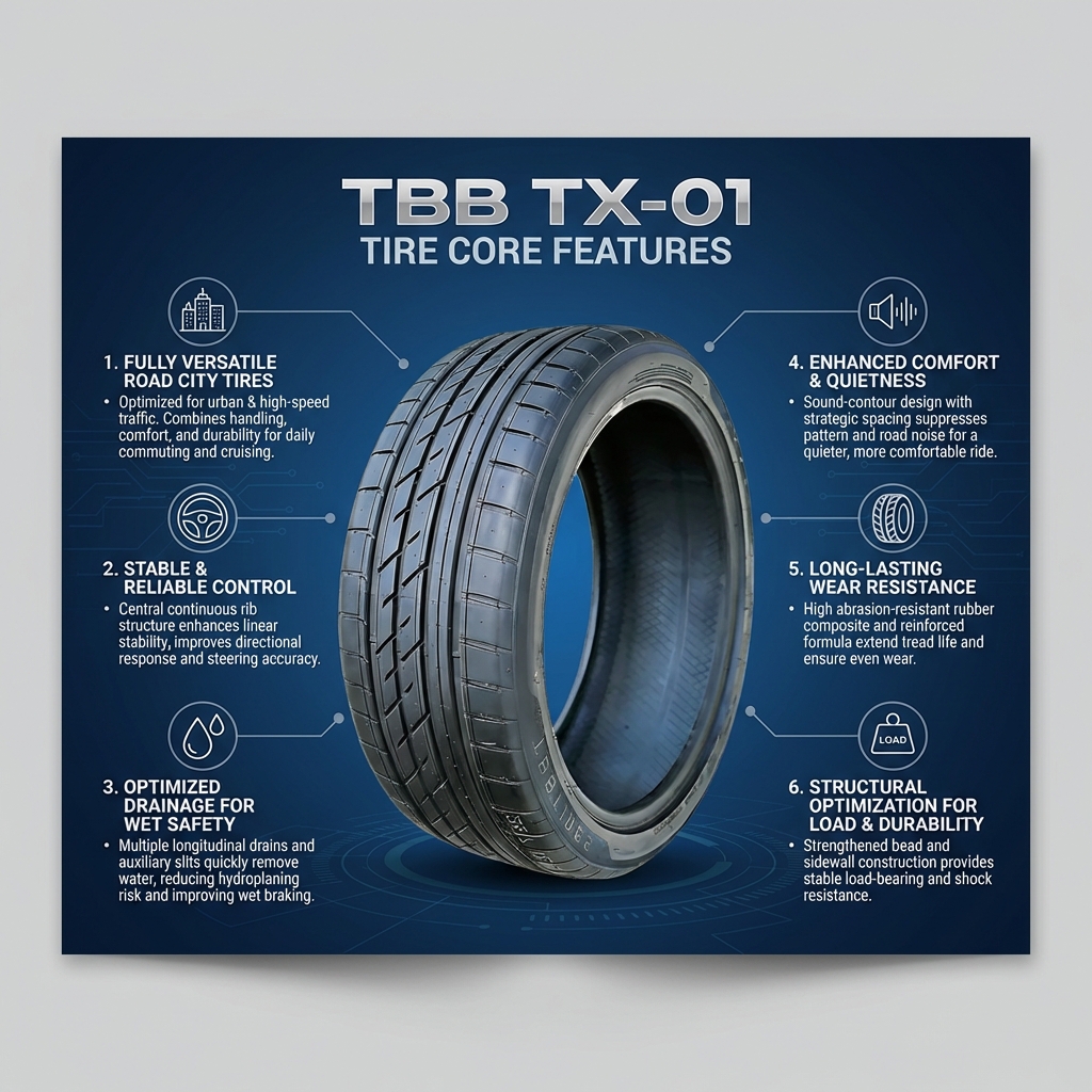 These TBB TX-01 tires are a solid upgrade — great grip in light rain and super stable on the highway. As a commuter driving 45 miles each way, I notice less road noise and smoother handling than my old all-seasons. Definitely worth the price for the control and confidence they give.